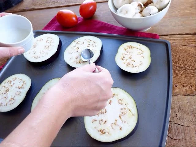 Arrange eggplant slices flat on a large non stick baking sheet and bake for 8 minutes, flipping them once at 4 minutes