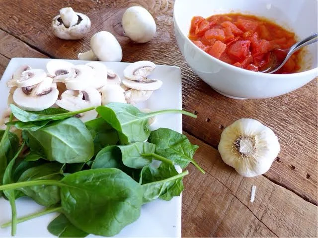 In a medium-sized sauce pan, combine 1 tablespoon of coconut oil, tomatoes, garlic, onion powder, and water