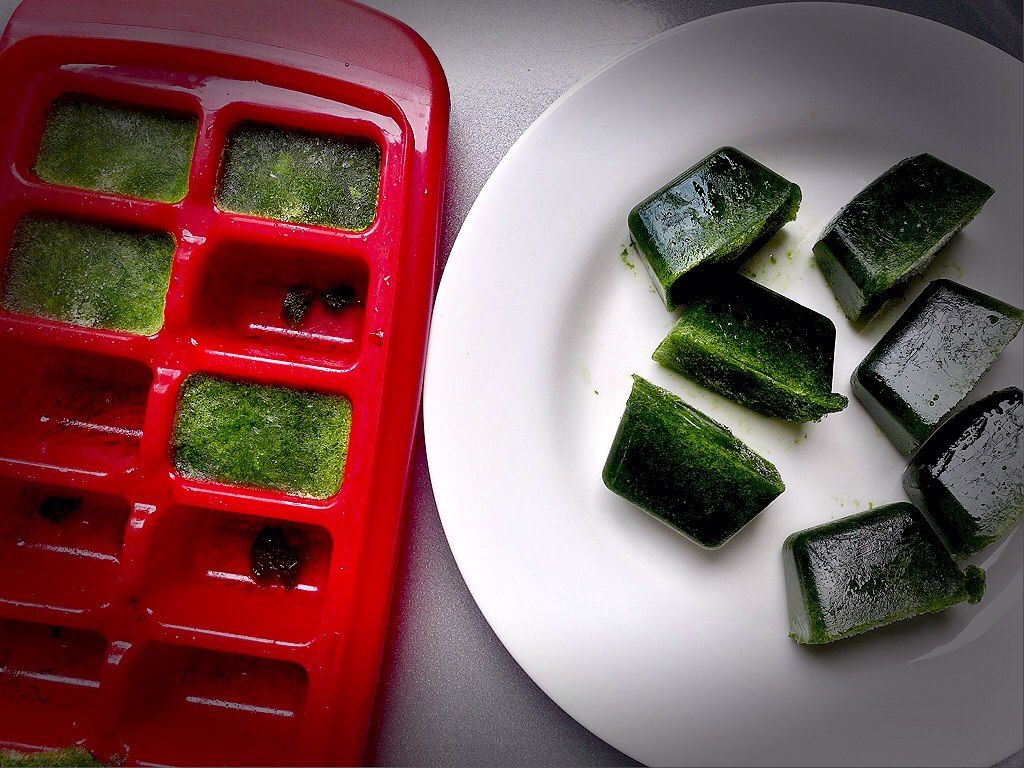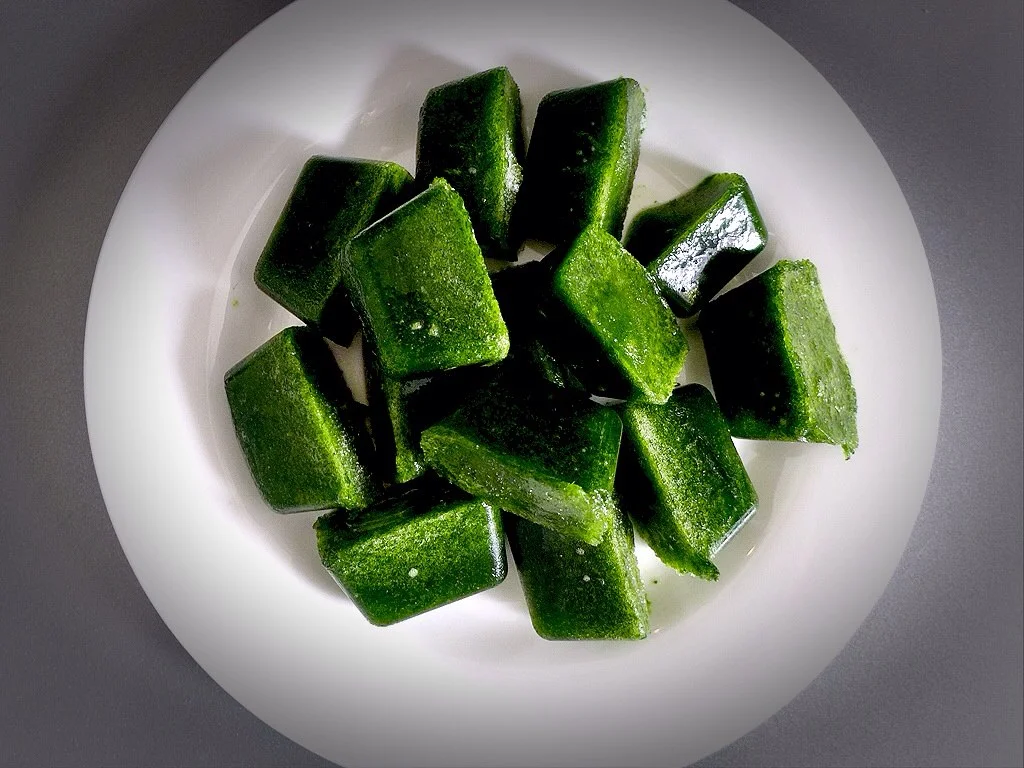 Frozen spinach cubes are perfect for preserving, cooking, and using in green smoothies.